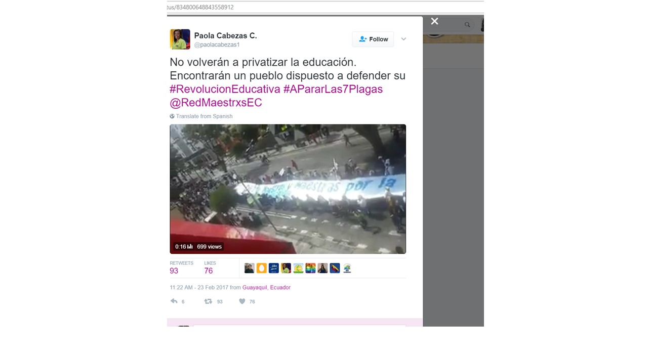 3. La manifestación a favor de Lenin en las afueras del Banco de Guayaquil. Dice la Constitución de Montecristi que parar los servicios públicos – educación- está prohibido. La LOEI también contiene la misma prohibición. Sorpresivamente, hoy, jueves, día laborable en Quito, donde el año lectivo está en curso y todas las instituciones educativas en actividades, la “Red de Maestros” salió a las calles a mostrar su apoyo al candidato oficialista en las afueras del Banco que ya no dirige el candidato opositor. No solo que esto raya en lo ridículo, sino que permite que cuestionemos qué ha pasado con el desarrollo profesional y formación inicial docente en el país. Lo sucedido hoy es una expresión manifiesta donde aquel que es cobijado por el gobierno puede incumplir la normativa constitucional y no le pasa nada. ¿Dónde estaban los estudiantes mientras los docentes estaban en la calle? El Estado le paga al docente oficialista para que se manifieste en horas laborables en contra de otro candidato, eso es una barbaridad. ¿Así quieren llegar a ser Finlandia?