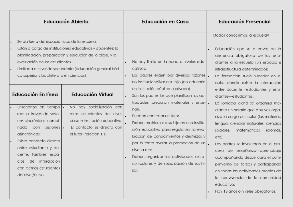 Hay términos que se han usado a partir de la pandemia para denominar el proceso de escolarización durante estos meses de cuarentena y los términos de los lineamientos de educación abierta y las definiciones en la LOEI y su reglamento. Lo importante de diferenciar y comprender a qué se refiere cada modalidad u oferta es para establecer las responsabilidades y el marco de acción de cada actor: institución educativa, familia, estudiante, gobierno, tutores, y docentes.