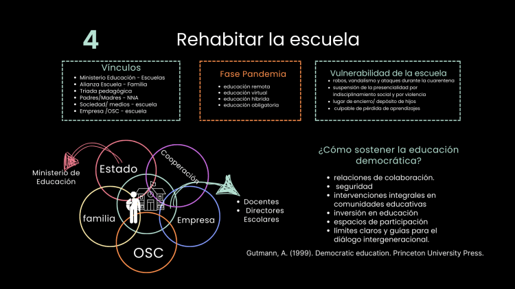 El objetivo de mi investigación es recopilar los aprendizajes de la educación durante la pandemia para el desarrollo de políticas educativas en la post-pandemia a través de la reconstrucción de los eventos significativos, relacionándolos con las experiencias y las decisiones de los actores del sistema educativo, para determinar su influencia en la transformación, el sostenimiento del derecho a la educación y la reapertura de escuelas. Además, identificar cómo el cierre de escuelas impactó en los vínculos de estos actores.