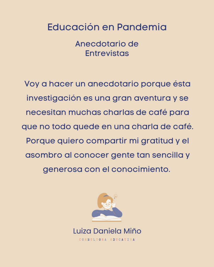 Desde marzo del 2020 he estado muy pendiente de compartir información y analizar la política educativa en cuarentena, participando en webinars, spaces y comentando en redes sociales. Hace un par de años decidí investigar con mayor profundidad y rigor lo que ocurrió durante la pandemia en el sistema educativo ecuatoriano, construyendo una nueva línea de investigación. El propósito de esta página es compartir tanto los avances como los obstáculos durante la indagación, esas notas al margen que no llegan a ser publicadas en los formatos académicos; las reflexiones y los recursos valiosos para quienes también están interesados en la educación durante la pandemia y la post pandemia.